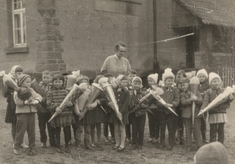 Vor dem Schulgebäude stehen die so genannten ABC-Schützen mit ihren Zuckertüten, die sie zum Tage der Einschulung (damals begann das Schuljahr noch am 1. April eines jeden Jahres) erhalten hatten.