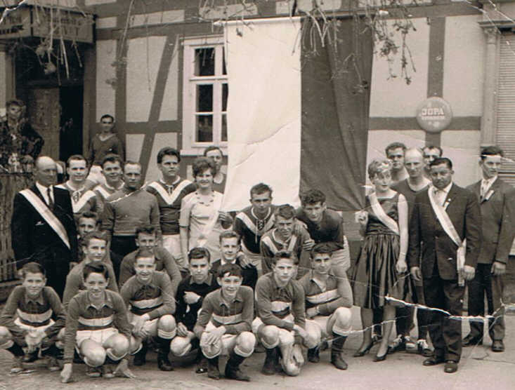 Nach dem Festumzug hatten sich Aktive des Sportvereins (vorrangig der A-Jugendmannschaft) vor der Gastwirtschaft für den Photographen aufgestellt. Zu jener Zeit war es übrigens Sitte, dass die örtlichen Vereine das Vereinslokal von Jahr zu Jahr wechselten bzw. neu festlegten.