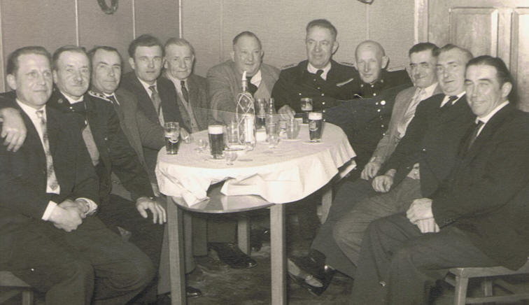 Dieses Photo, das mit großer Wahrscheinlichkeit aus dem Jahre 1962 stammt, wurde nach einer Sitzung des Rates der Gemeinde Hettensen im Gasthaus Zur Post [Inhaber Carl Brede] gemacht. Zugegen ist auch das Kommando der Freiwilligen Feuerwehr Hettensen mit dem Ortsbrandmeister Albert Ellies, seinem Stellvertreter August Ische und Albert Ahlborn.