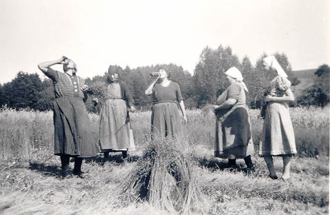Die Getreideernte hatte mehrere Seiten: Einmal war das Mähen des Getreides mit der Sense sowie das Herstellen der Seile [aus Stroh] und das Binden zu Bunden recht anstrengend und zeitaufwändig, andererseits aber hat man sich aber zu den Pausen ein wenig mehr Zeit genommen als in der Gegenwart und, wie unschwer zu erkennen ist, auch schon mal ein Gläschen Schnaps getrunken. Im Laufe des Tages konnten dann schon schnell mehrere Gläser des Hochprozentigen konsumiert werden, was bei der harten körperlichen Arbeit nicht so sehr ins Gewicht fiel.
