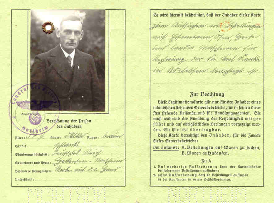 Bei dem vorliegenden Dokument handelt es sich um einen Gewerbeschein, der vom Landratsamt des Kreises Northeim in den 1930er Jahren ausgestellt wurde.
