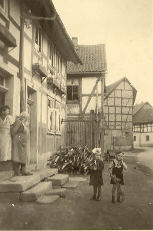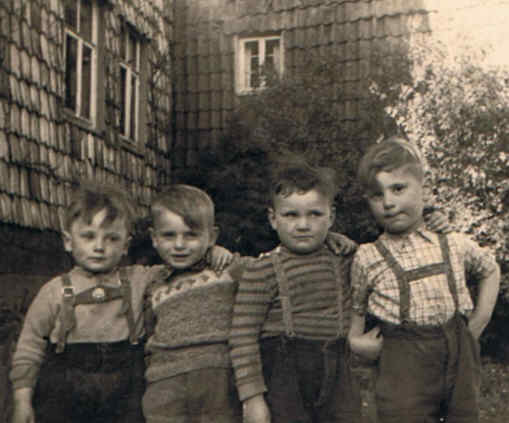 Vor dem bäuerlichen Anwesen der Familie August Kreitz senior [links] und dem der Familie Karl Ruwisch [rechts] stehen von links nach rechts August Kreitz jun., Karl-Heinz Ruwisch , Otto Ahlborn jun. und Gerhard Helmbrecht. Die Jungs, die in der Oberdorfstraße [Friwoler Straße] in direkter Nachbarschaft wohnten, spielten zu jener Zeit nachmittags regelmäßig zusammen und waren auch sonst nahezu unzertrennlich. So fiel es auch nicht schwer, vor dem Photographen ihre tiefe Freundschaft zu demonstrieren.