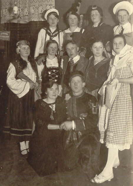 Zu erkennen sind u.a. Käthe Brede [verh. Ahlborn], Leni Bierkamp [Koch], Frieda Grapp [Gründel], Gertrud Brede [Storre], die sich zum Kappenfest brauchtumsgemäß verkleidet hatten.