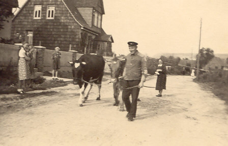 Auf dieser Photographie, die vermutlich Anfang der 1950er Jahre gemacht worden ist, ist August Friedrichs zu sehen, wie er mit seinem Kuhgespann durch die Friwoler Straße offensichtlich zu einem Feld zieht.